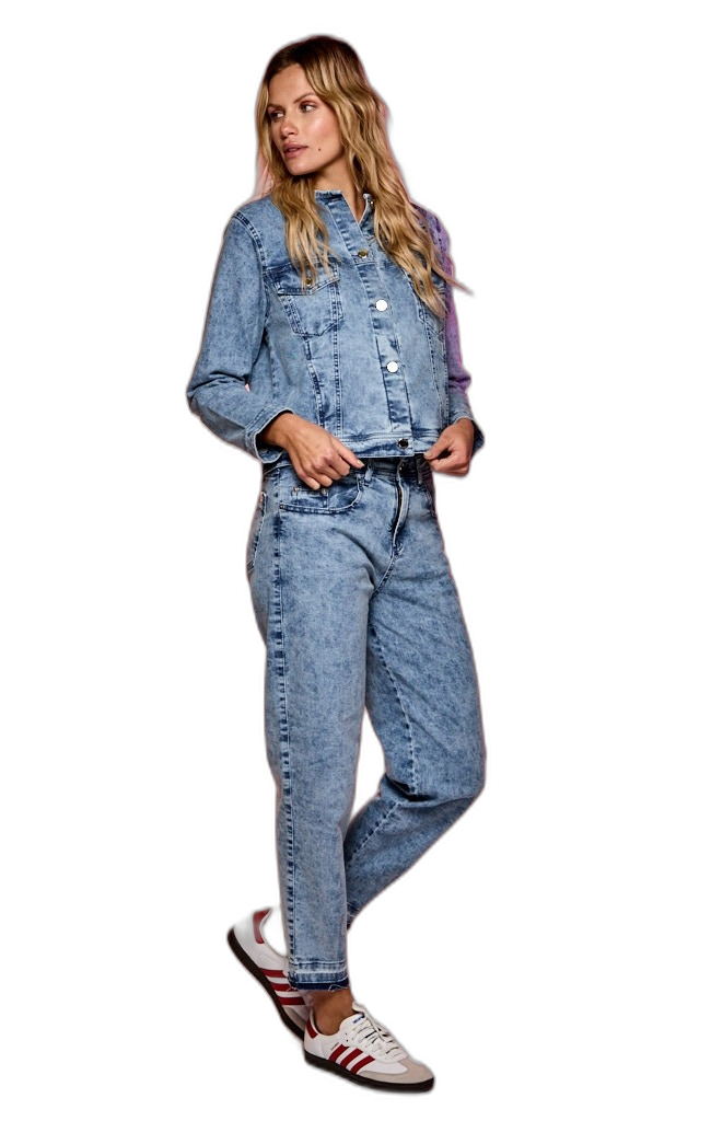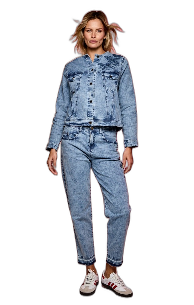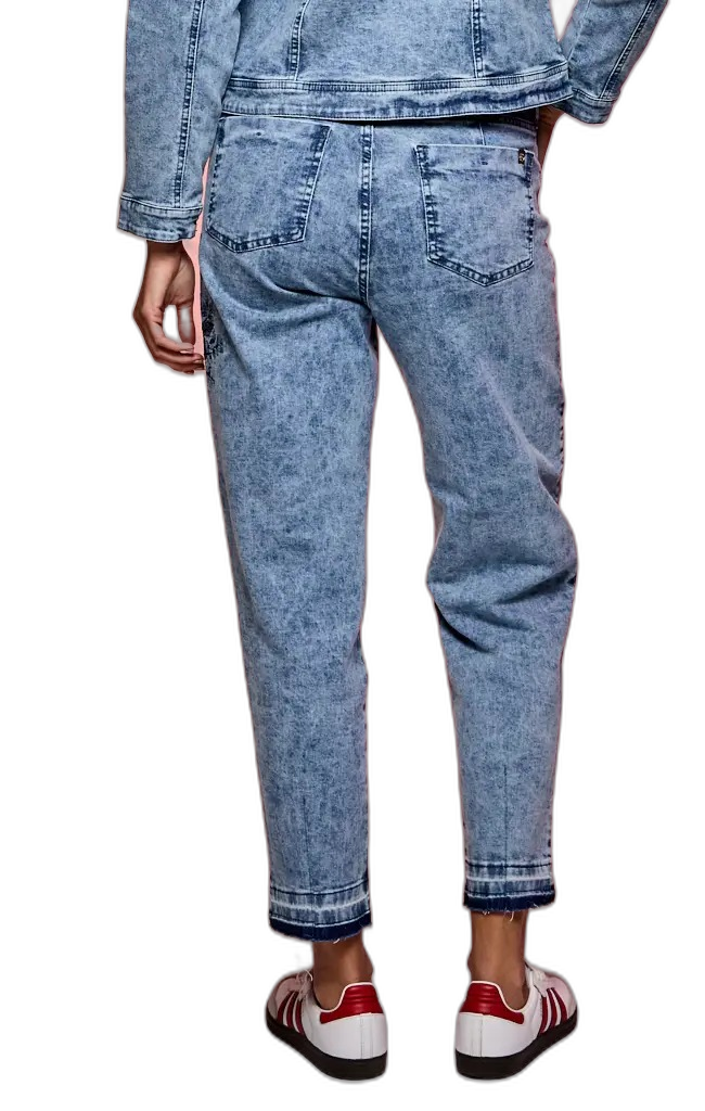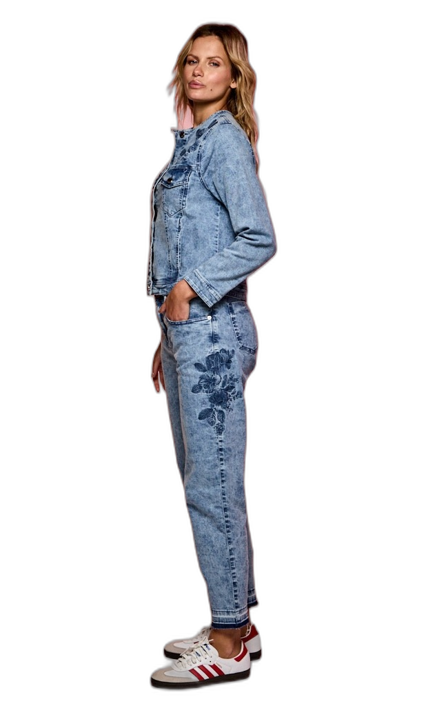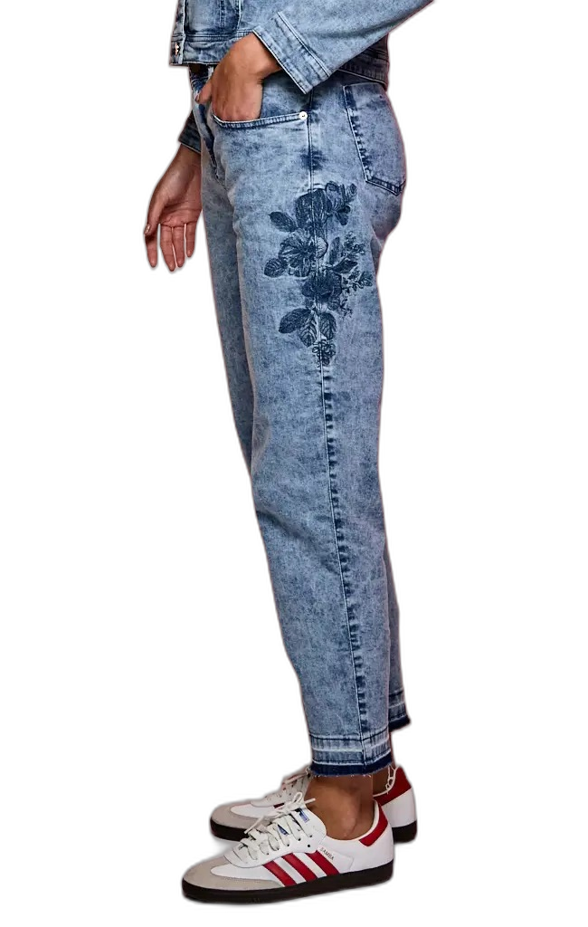 Mom con 5 bolsillos y spandex, tiro medio alto. Pinzado en final de botamanga de ambos lados, cortado tipo con tijera con desgaste marcado en azul fuerte. Bordado de flores a tono en lateral izquierdo