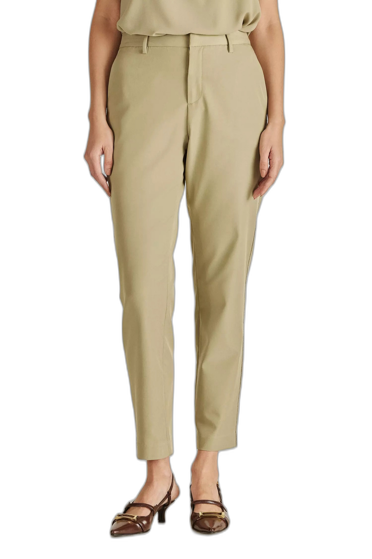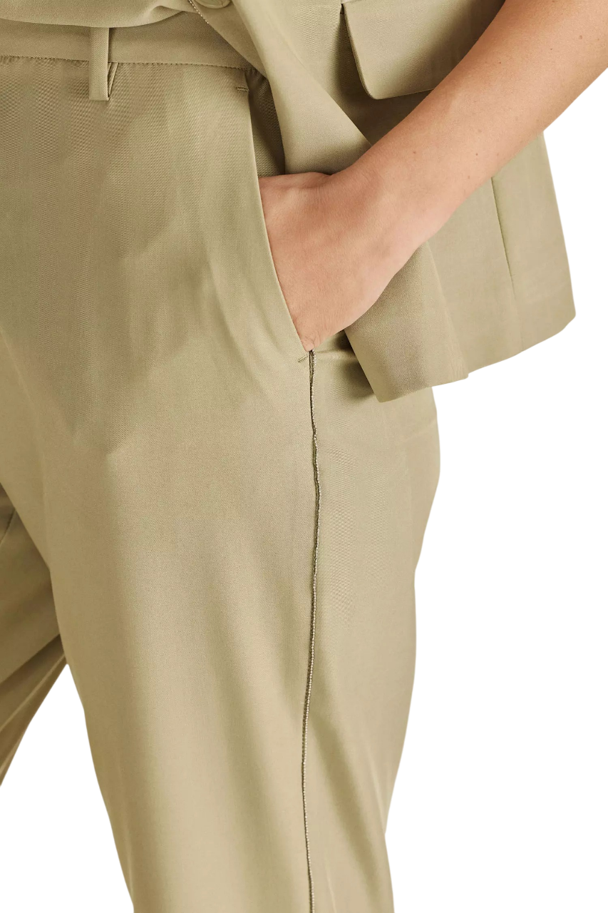 Pantalón sastrero con impronta femenina, el cual realza la figura con un calce impecable y suma el detalle distintivo del galón metálico, a juego con el saco Niza. Disponible en colores army y crudo, perfectos para la temporada.