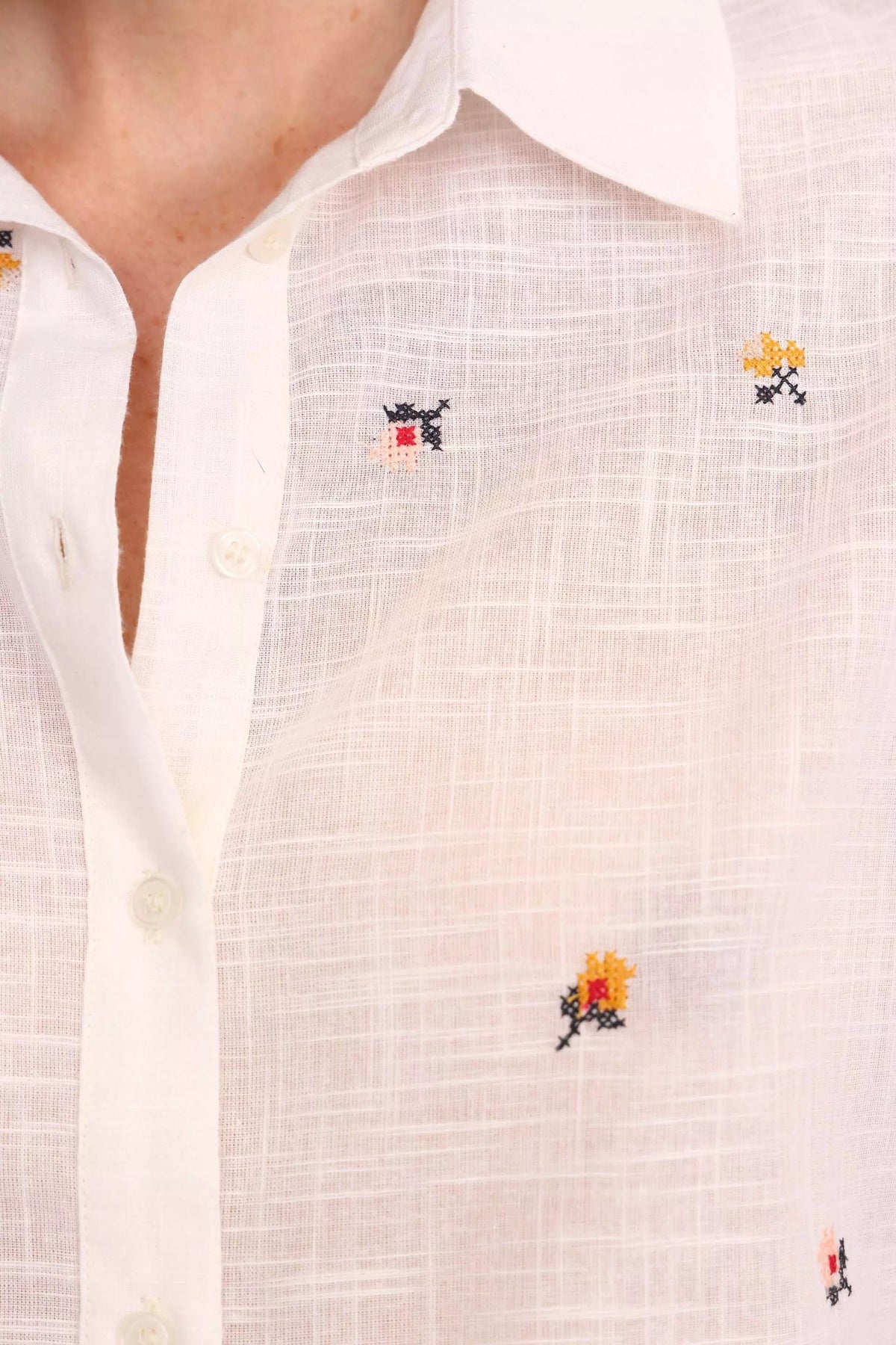 Dale un toque romántico y refinado a tu guardarropa con la Camisa Tatiana, confeccionada en tejido liviano con bordados florales delicados que aportan textura y feminidad. Ideal para combinar con denim o prendas de vestir en un look sofisticado y cómodo.